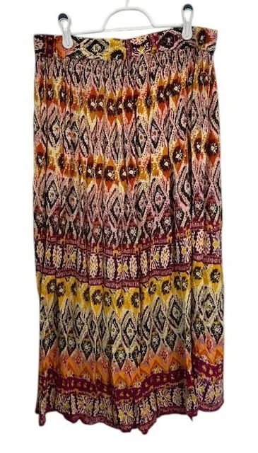 A vibrant statement piece! This eye-catching maxi skirt showcases a beautiful bohemian-inspired diamond print in a rich array of colors, creating a global-chic vibe. The comfortable elastic waistband ensures a flattering and flexible fit, perfect for all-day wear. Lightweight and flowing, this skirt adds a touch of effortless elegance to any outfit. Wear it with sandals and a tank top for a relaxed summer look, or dress it up with heels and a blouse for a night out. Ideal for vacation, weekend brunches, or adding a pop of color to your everyday style. Flat Lay Measurements: Waist = 16" Length = 33" Type: Skirt Style: Maxi Skirt Length: Long Color: Multicolor Pattern: Geometric Material: Rayon, Viscose Accents: Ruffle Features: Elastic Waist, Lightweight Character: Boho, Festival Closure: Pull On Occasion: Casual, Travel, Party/Cocktail Keywords: maxi skirt, boho skirt, bohemian skirt, diamond print, ethnic print, multicolor skirt, elastic waist, womens skirt, summer skirt, casual skirt, vacation skirt, Chaudry KC, XL skirt