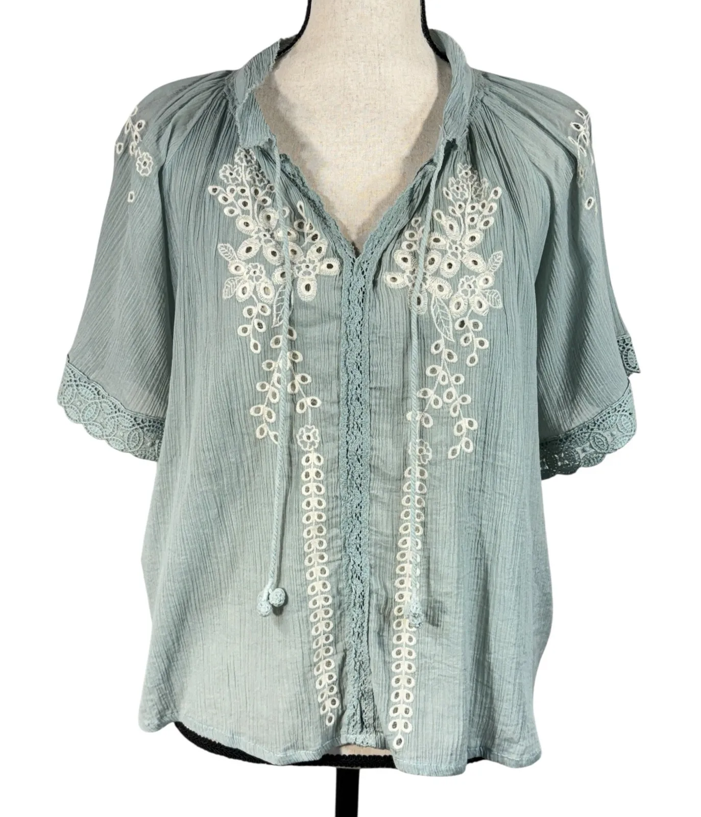 Chelsea & Theodore Medium Top * Floral Eyelet / Embroidered * Crochet Accents * Elbow Length Flared Sleeves * Gauzy Fabric * V-Neck with a Tie * Raw, Frayed Collar Edge * Stretch * Lightweight / Semi-Sheer (will need a cami) * Sage Green Please check measurements to ensure proper fit. Bust: 47" Length in the back from the shoulder to the hem: 23" Measurements are approximate, laying flat and unstretched. Smoke free home.