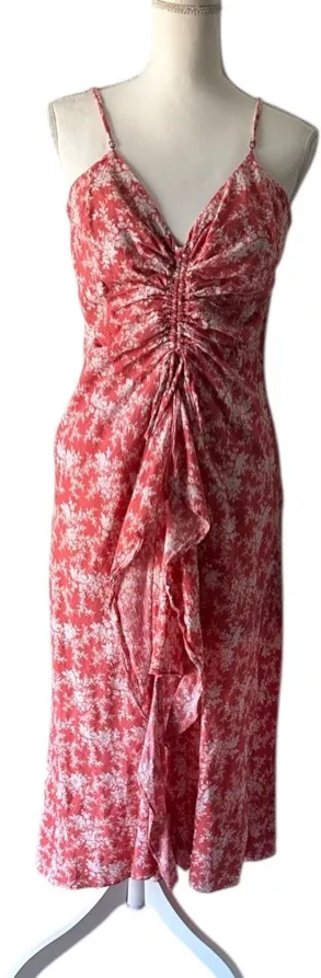 Chic asymmetrical dress with floral pattern. Features a ruched front. Ideal for stylish outings.