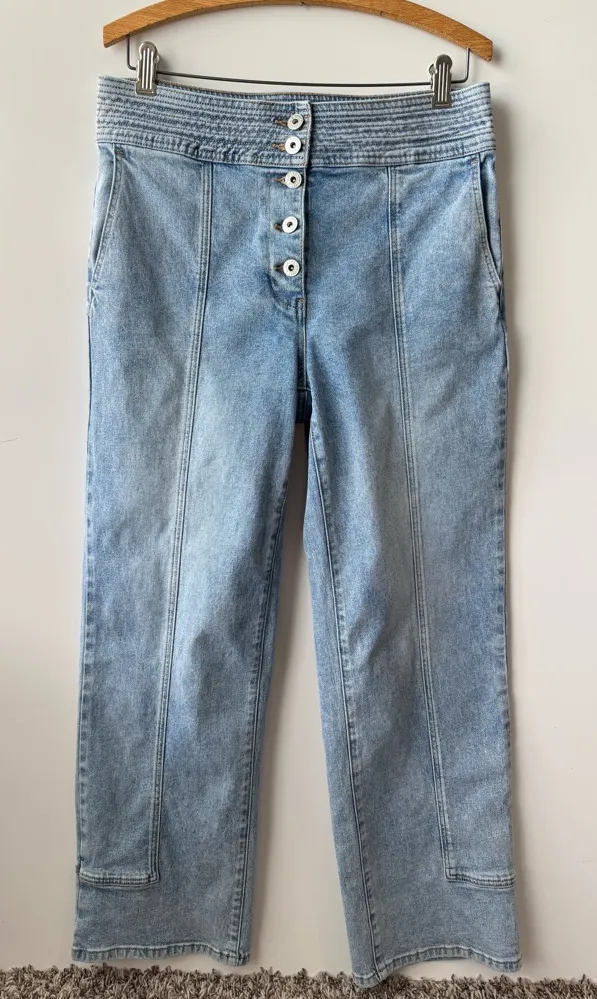 These Chelsea & Violet jeans showcase a classic straight-leg silhouette in a soft blue hue, perfect... Show more