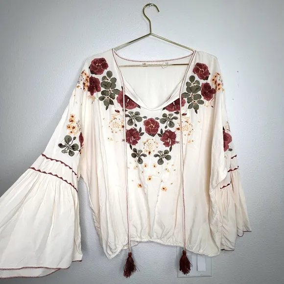 Chelsea & Violet Embroidered Women's Boho Blouse sz M tie neck, full and wide sleeves cream with... Show more