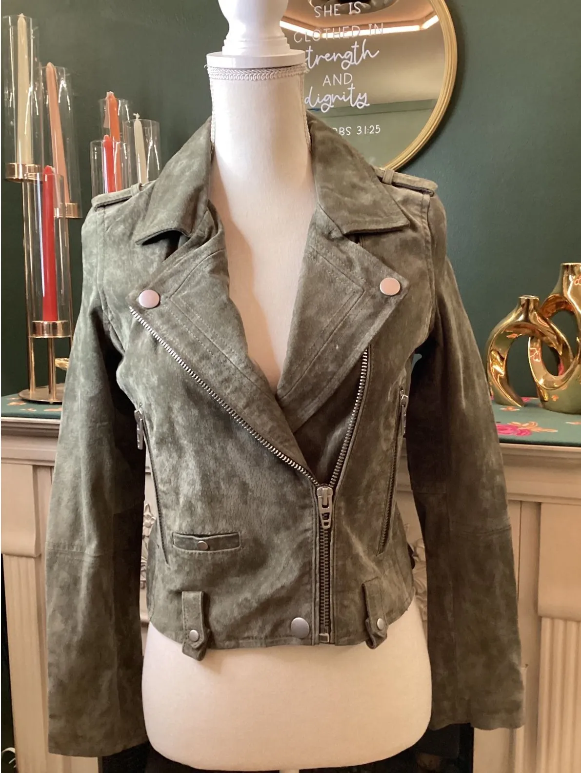Own the road with this Chelsea & Violet olive green suede moto jacket. The rich, textured suede dra... Show more