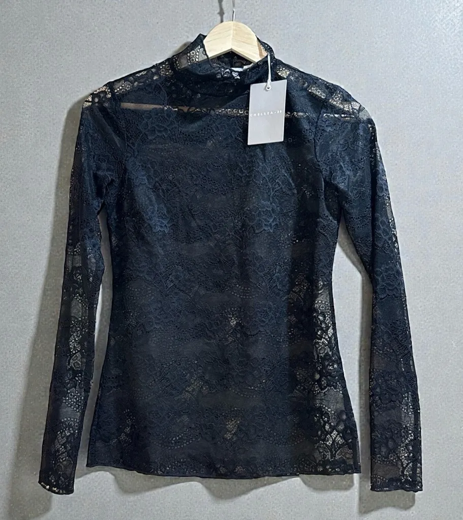 This elegant black lace top is perfect for any occasion. Its intricate design adds a touch of sophistication to your wardrobe. New with tag - See photos for details. Approximate measurements - Underarm to underarm: 15.5" Length, shoulder down: 20" Sleeve, underarm to cuff: 23.5"