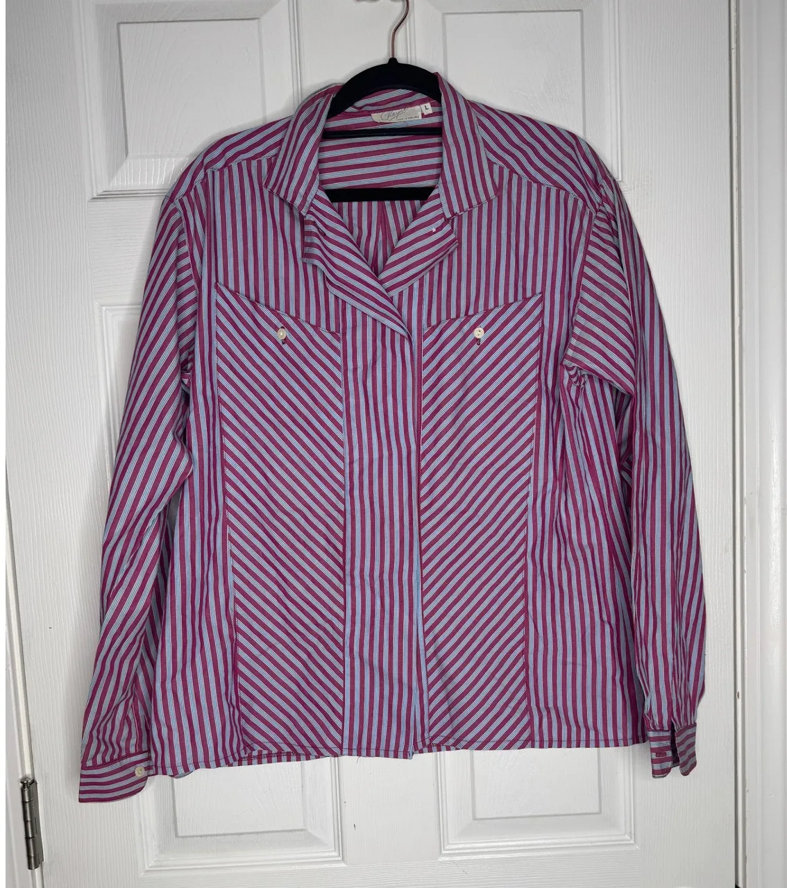 Cheyne Woman's Raspberry and Blue Striped Button-Down Hidden Buttons Size L Pink Size L - $25 - From Laura
