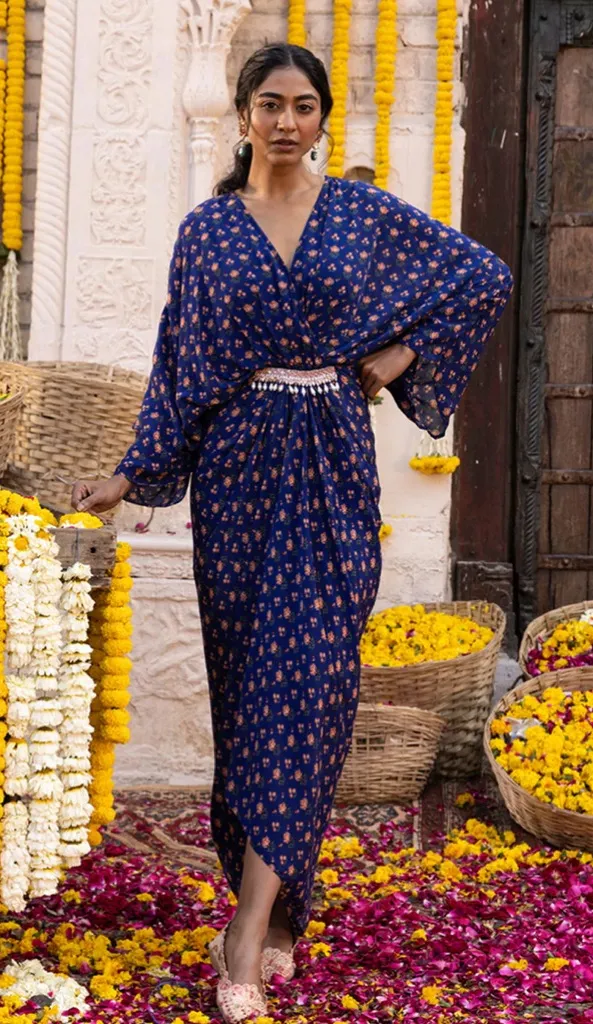 Featuring Here Royal blue printed draped dress with kaftan style sleeves. This set has embroidered w... Show more