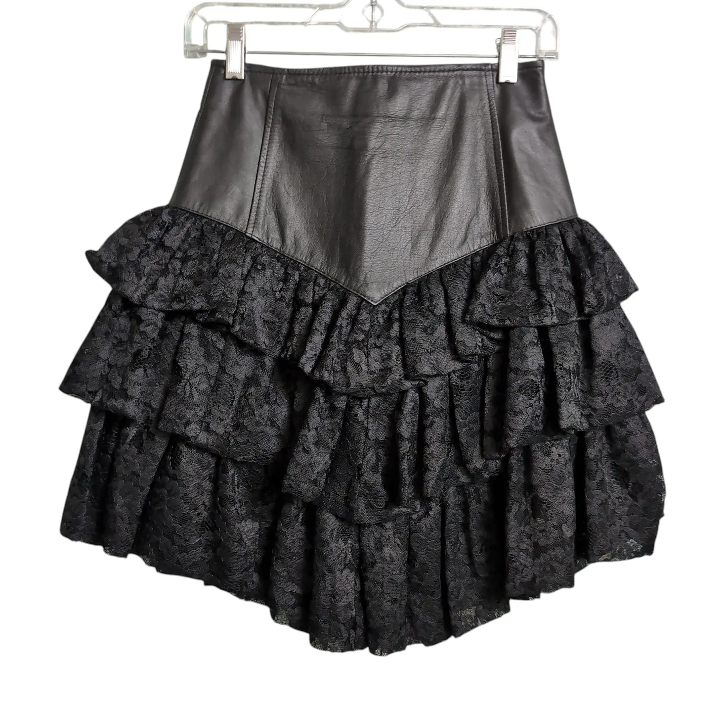Make a bold statement with this leather and lace mini skirt. This authentic vintage Y2K piece blends edgy leather with feminine lace for a striking look. Features a genuine leather yoke offers a luxurious and structured feel. This is contrasted by tiered nylon lace ruffles for a fun, flouncy, and dark romantic silhouette. The layers create fantastic movement, embodying the playful yet rebellious spirit of early 2000s. NOTE: Small imperfection in leather near waistband (see photo for details). * Back zip closure. * Top panel: Genuine leather; Bottom panel: nylon lace. * Bodycon fit through the waist with a tiered ruffle hem. * Excellent pre-owned vintage condition. Approximate Measurements (flat lay): * Waist: 12.5" * Length: 20.5" Care: Special leather cleaner only. * Gothic Romance: Pair with a mesh or sheer black top, combat boots, and silver or gunmetal jewelry. * E-Girl/Alt Fashion: Style with an oversized graphic band tee (tucked in), platform sneakers or boots, and fishnet tights. * Coquette/Dark Balletcore: Pair with sheer hosiery, a fitted black bodysuit or cashmere knit, and Mary Jane heels. * Edgy Glam: Pair with a silky camisole or fitted sequin top and stiletto heels. * Y2K Revival: Pair with a baguette bag, chunky heels or platform boots, and a cropped top or baby tee. Keywords: Mini skirt, jet black, ebony, ruffle, gothcore, dark academia, dark romantic, emo, punk, Y2K, vintage, 2000s, 00s, night out, cocktail, date night, winter, fall, dramatic.