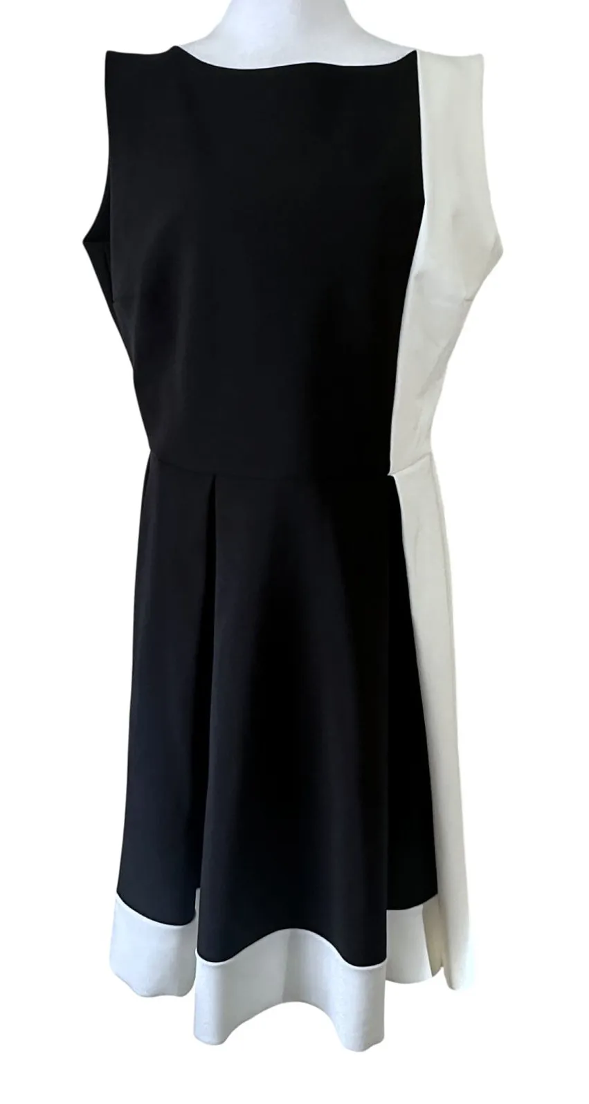 Chiara Boni La Petite Robe black and white A-line cocktail dress. Sleeveless, pleated skirt, color block design. Labeled size 50, measures US size 12. Approximate measurements bust 39" waist 32" hip 46" length shoulder to hem 38.5". Fabric has stretch. Excellent used condition with no rips, stains or odors.