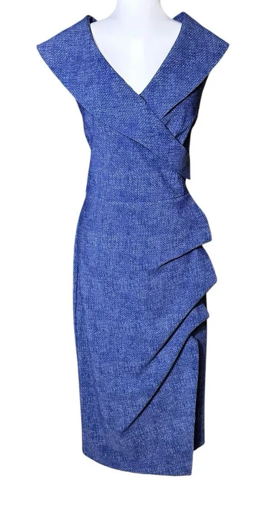 Gorgeous blue cocktail midi dress. Pullover style. Ruffle neckline. Ruched. Hook/eye clasp at bust. EU size 50. US size 14. No flaws. Length 48” Pit to pit 19” Waist 16” Stretchy material.