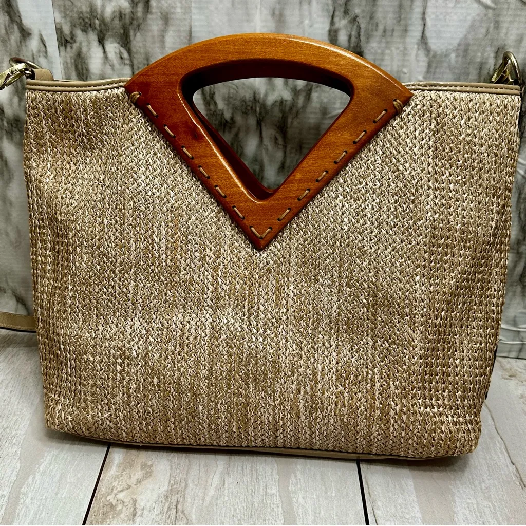 Elevate your style with this chic tan woven tote, featuring a distinctive wooden handle. Perfect for any occasion. There is a mark on the bottom and slight wear to the corners. Please see pictures for details and condition.