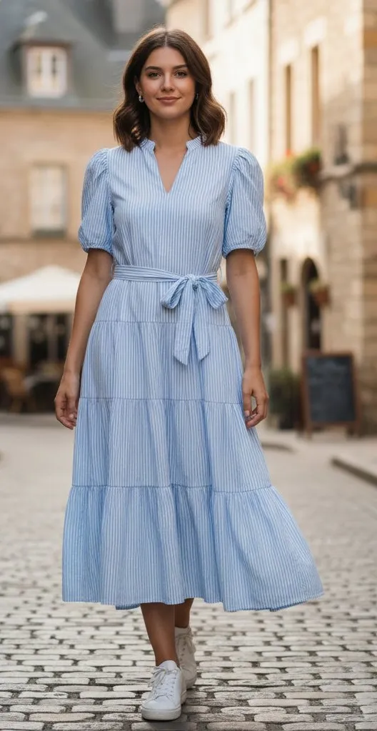 Chic Vintage Charm Cottagecore Pinstripe Tiered Tie-Waist Midi Dress M Size M - $30 - From Llanely