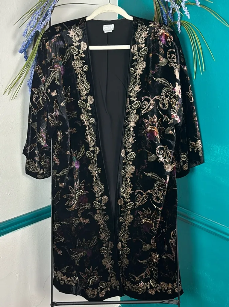Chico's Black Crushed Velvet Jewel-Toned Floral Imprinted Oversized Boho Kimono Size sm Check measur... Show more