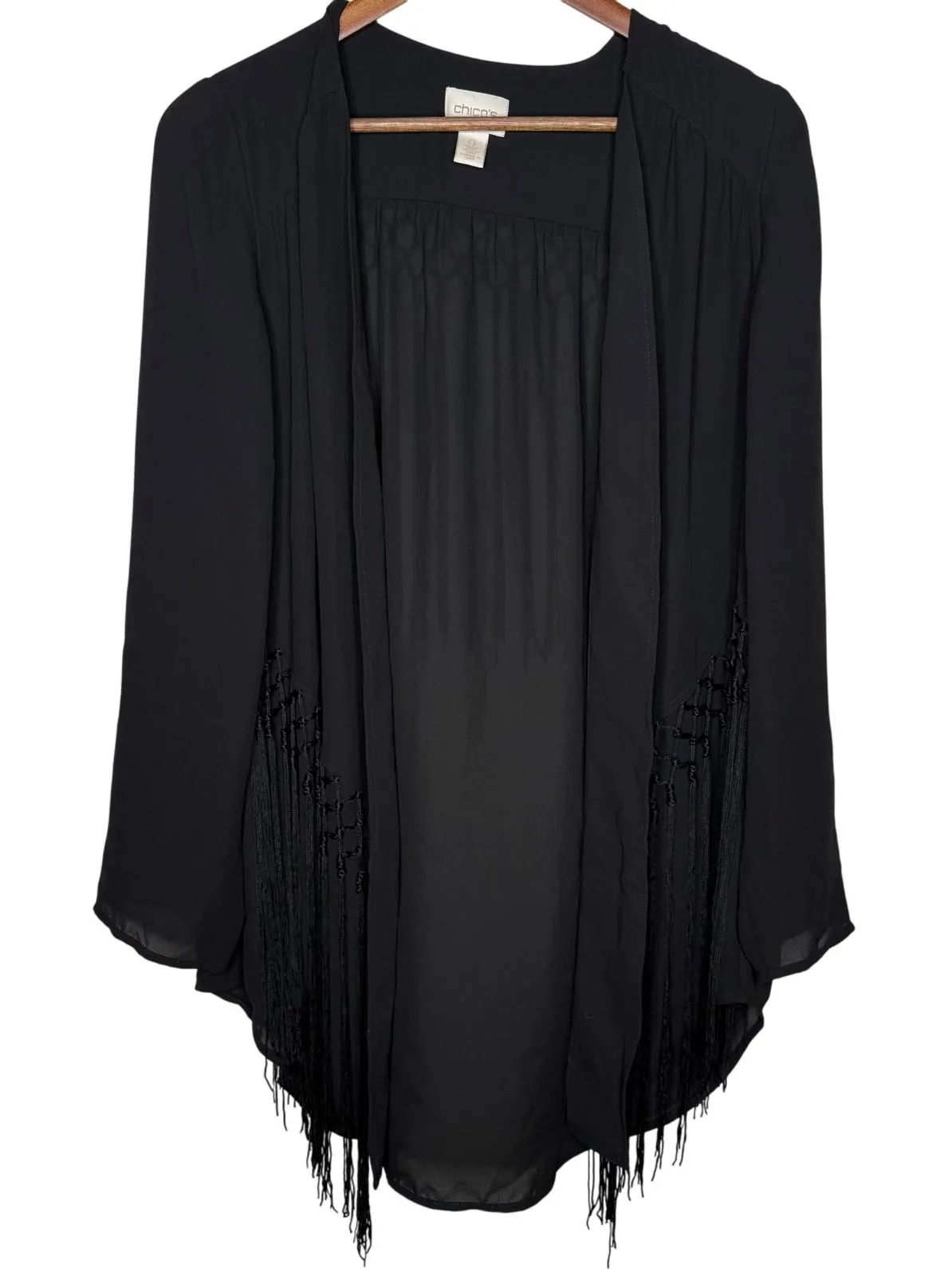 Keywords: Chico's, Kimono, Duster, Cardigan, Fringe, Black, Bohemian, Boho, Chic, Open Front, Lightweight, Layering, Festival, Party, Evening