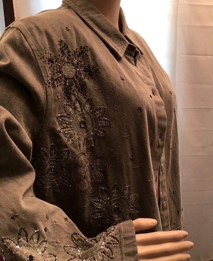 Gorgeous beaded khaki Chico’s jacket. Few beads are missing & difficult to detect with some of the d... Show more