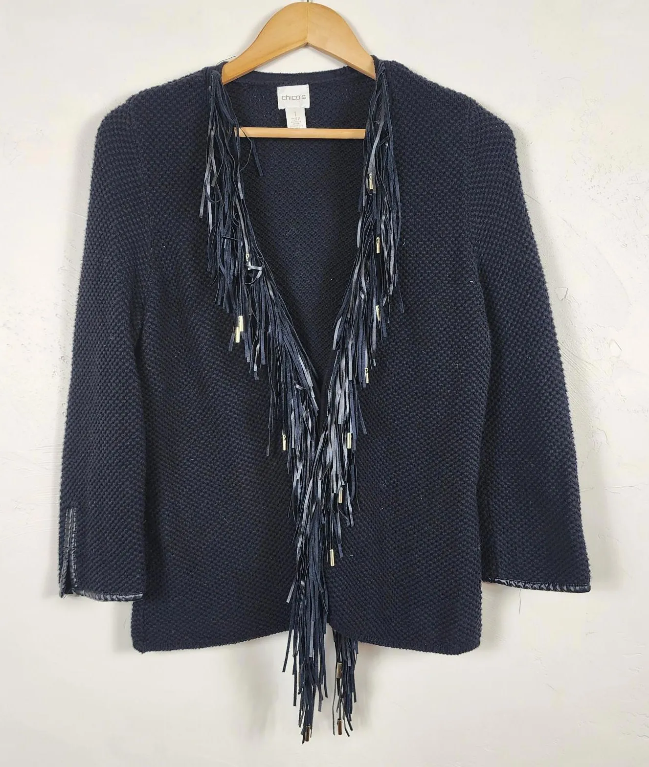 Add a touch of sophisticated edge to your look with this unique Chico’s open-front jacket. It featur... Show more