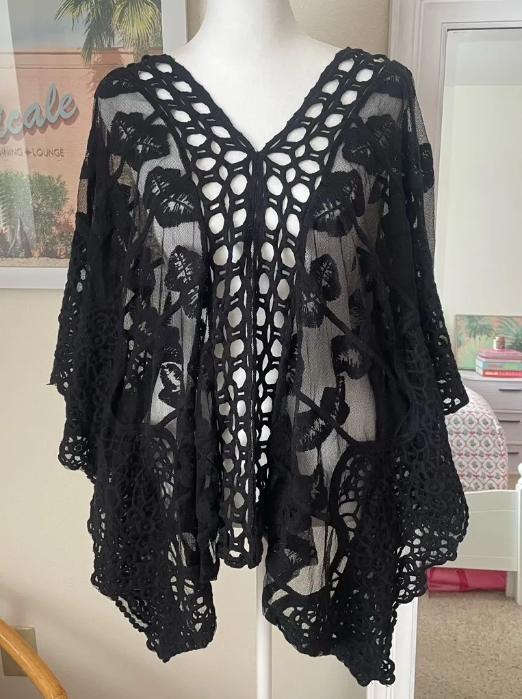 — Gently used, minor wear on edges Black — Relaxed fit Crochet lace mesh and cutouts Batwing ponch... Show more