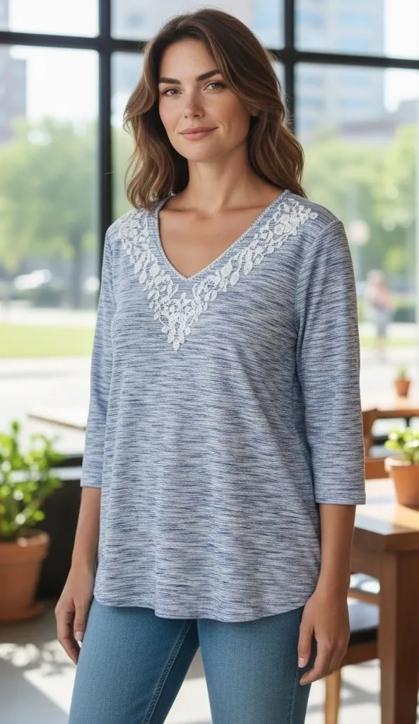 GENERALLY SHIP SAME OR NEXT DAY FROM FLORIDA!!! A marled knit top with a V-neckline accented by del... Show more