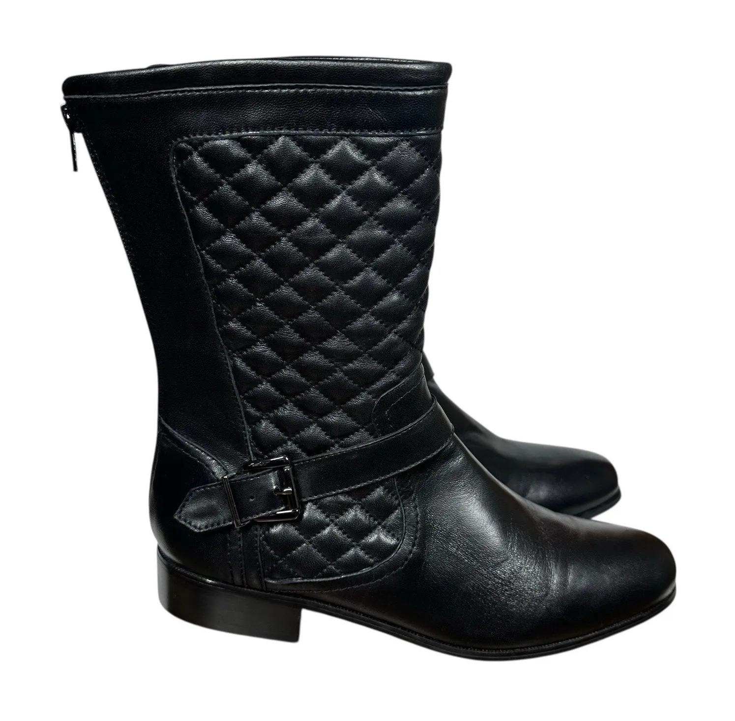 Chico's Ramon Boots Womens Size10M Black Leather Quilted Mid Calf Zip Buckle Moto Photos Show Exact... Show more