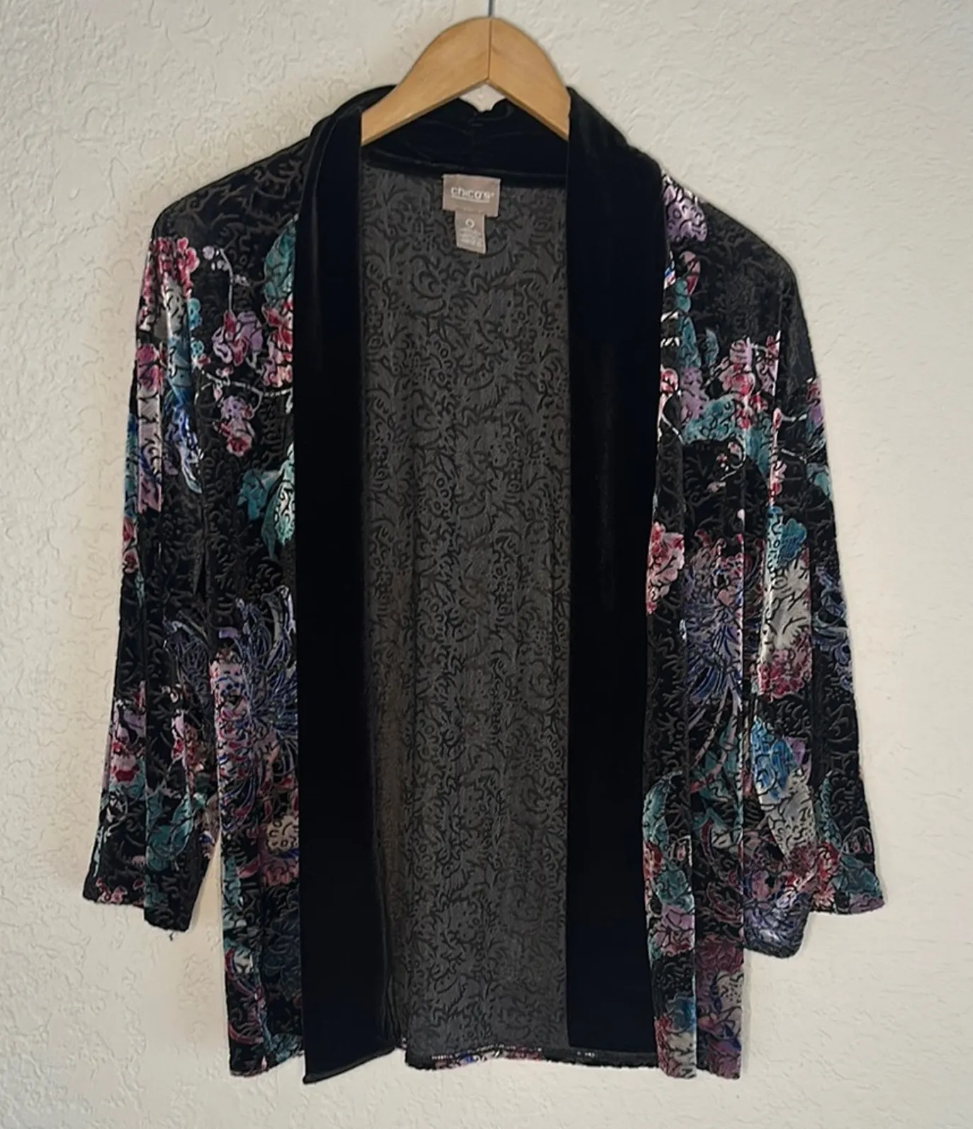 Chico’s Burnout Velvet Cardigan Sweater Size 0 which is medium on Chicos chart Shrug open style B... Show more