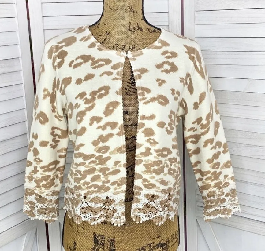 Chico’s Charlee Cheetah Lace Hem Crop Cardigan Sweater Cream Tan Size Small 4 Chico’s Size 0 Iv... Show more