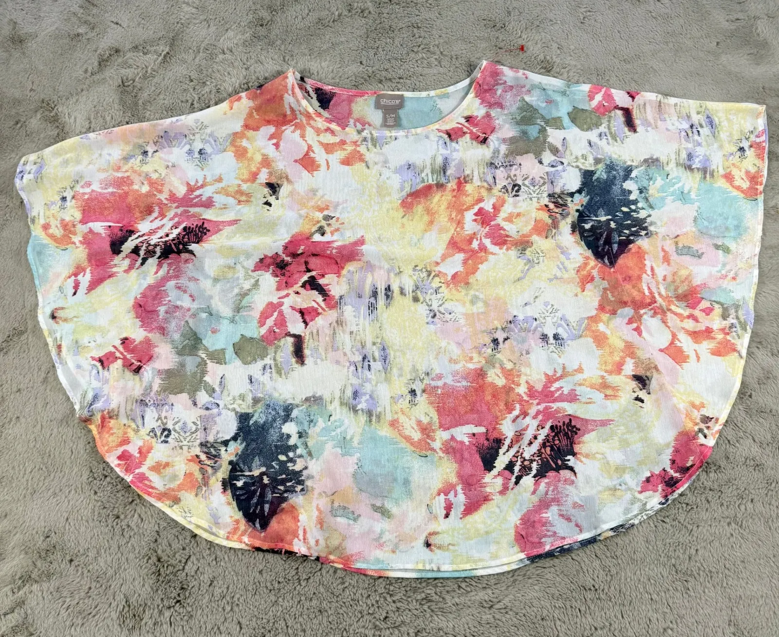 Keywords: Chicos blouse, floral blouse, multicolor top, flowy blouse, lightweight top, bohemian top, summer blouse, casual top, printed blouse, womens top, spring blouse, S/M blouse