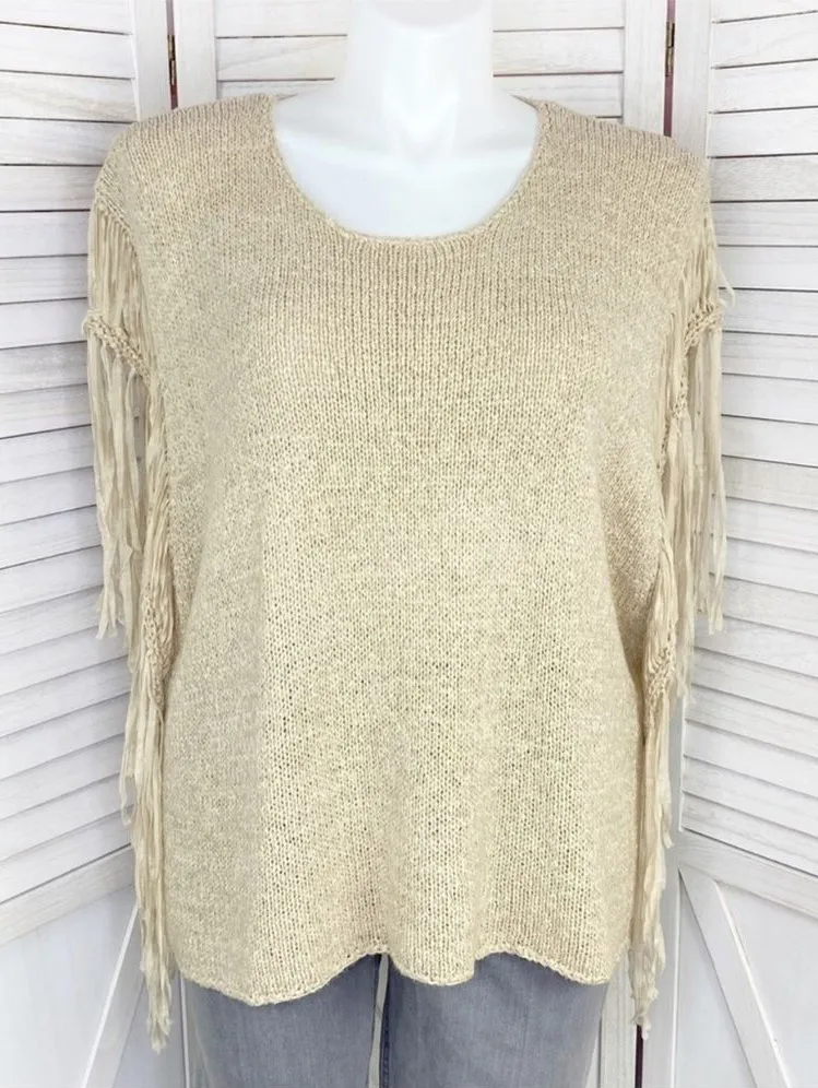 Chico’s Fringe Sleeve Tarrin Tape Yarn Poncho Sweater Size Large XL Taupe tan color Open chunky k... Show more