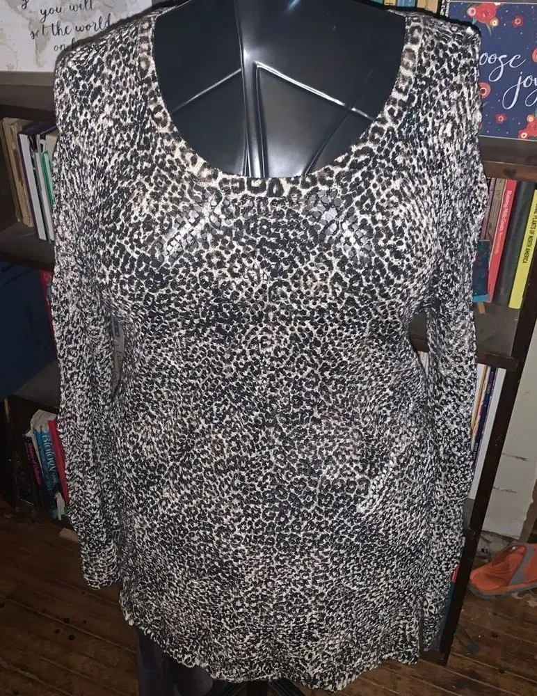 Chico’s leopard print, crochet, scoop neck tunic. Works great as a cover up. Or, pair with jeans or... Show more
