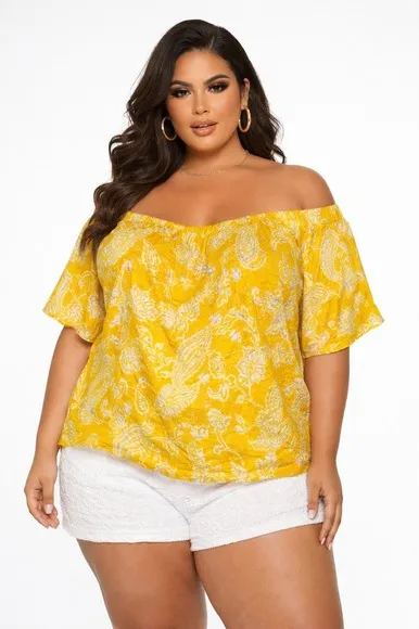 Chicos Linen Yellow Paisley Off-Shoulder Resortwear Tee NWT Measurements Laying Flat!! Size - 4/XXL... Show more