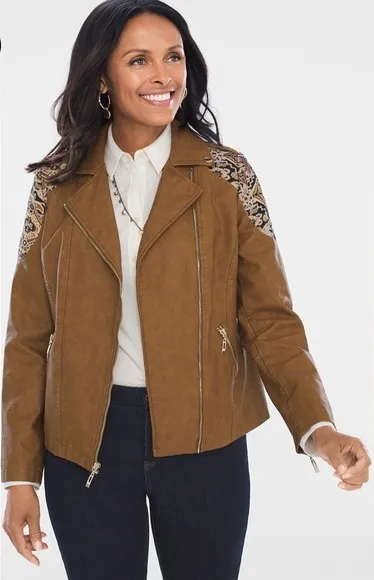 Southwestern flair. The faux-leather jacquard design is perfected with seam details and zipper pocke... Show more