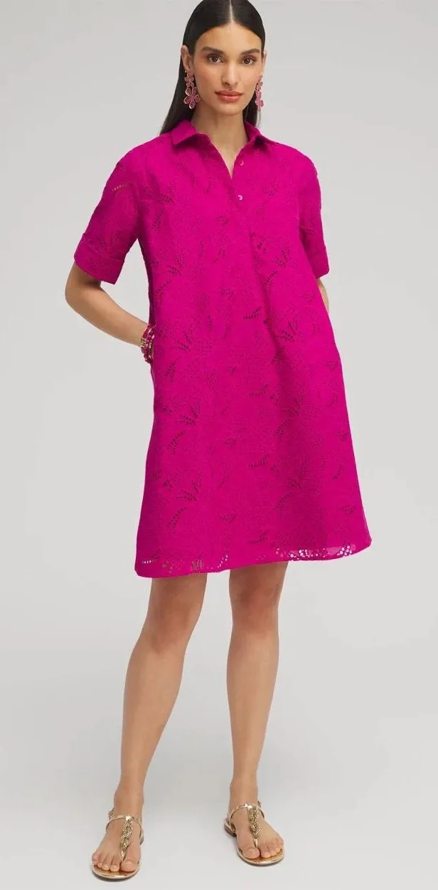 Chicos Raspberry Pink Eyelet Button Neck Shirt Dress Women's Pockets US Size 4 (Chico's sz 0) NEW w... Show more