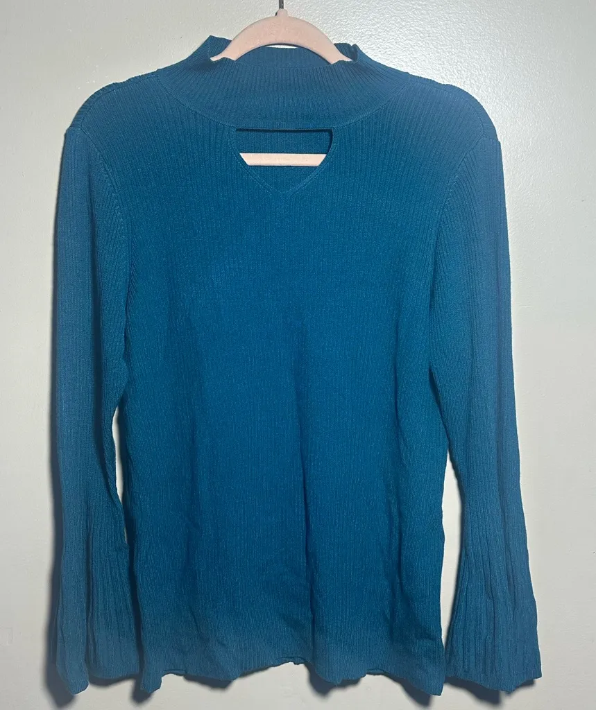 Chicos Women’s Sweater Size 2 P2P measures 19” Length measures 26” Teal colored Keyhole opening in f... Show more