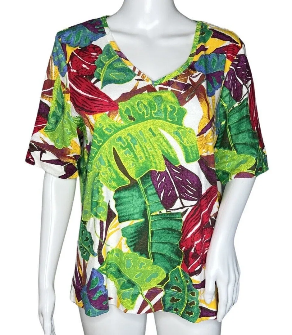Chicos Shirt Womens Large Green Yellow Botanical Print Colorful Tropical Cruise Women's Size Large... Show more