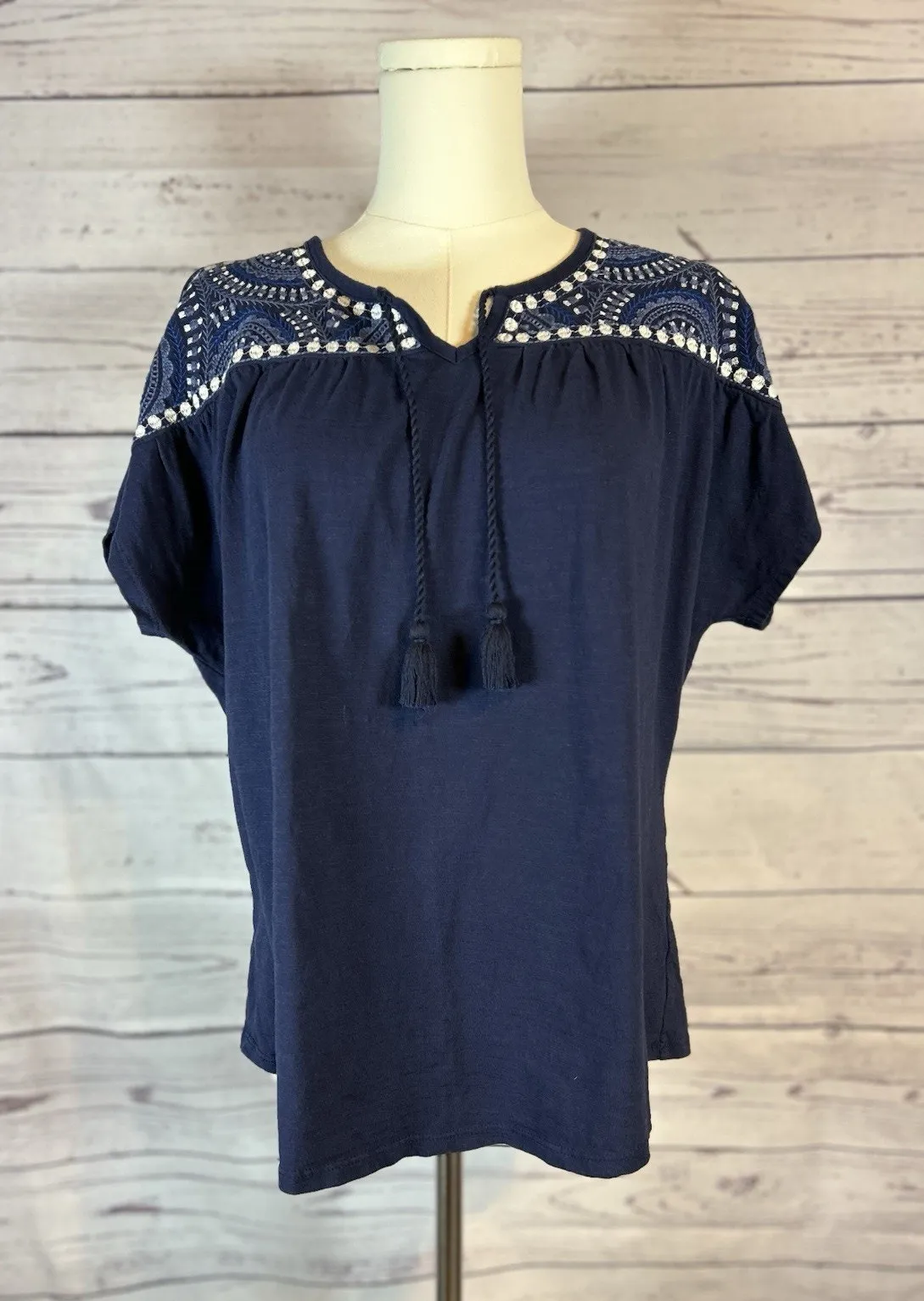 Chico’s navy blue 100% cotton embroidered top featuring beautiful boho-style detailing across the sh... Show more