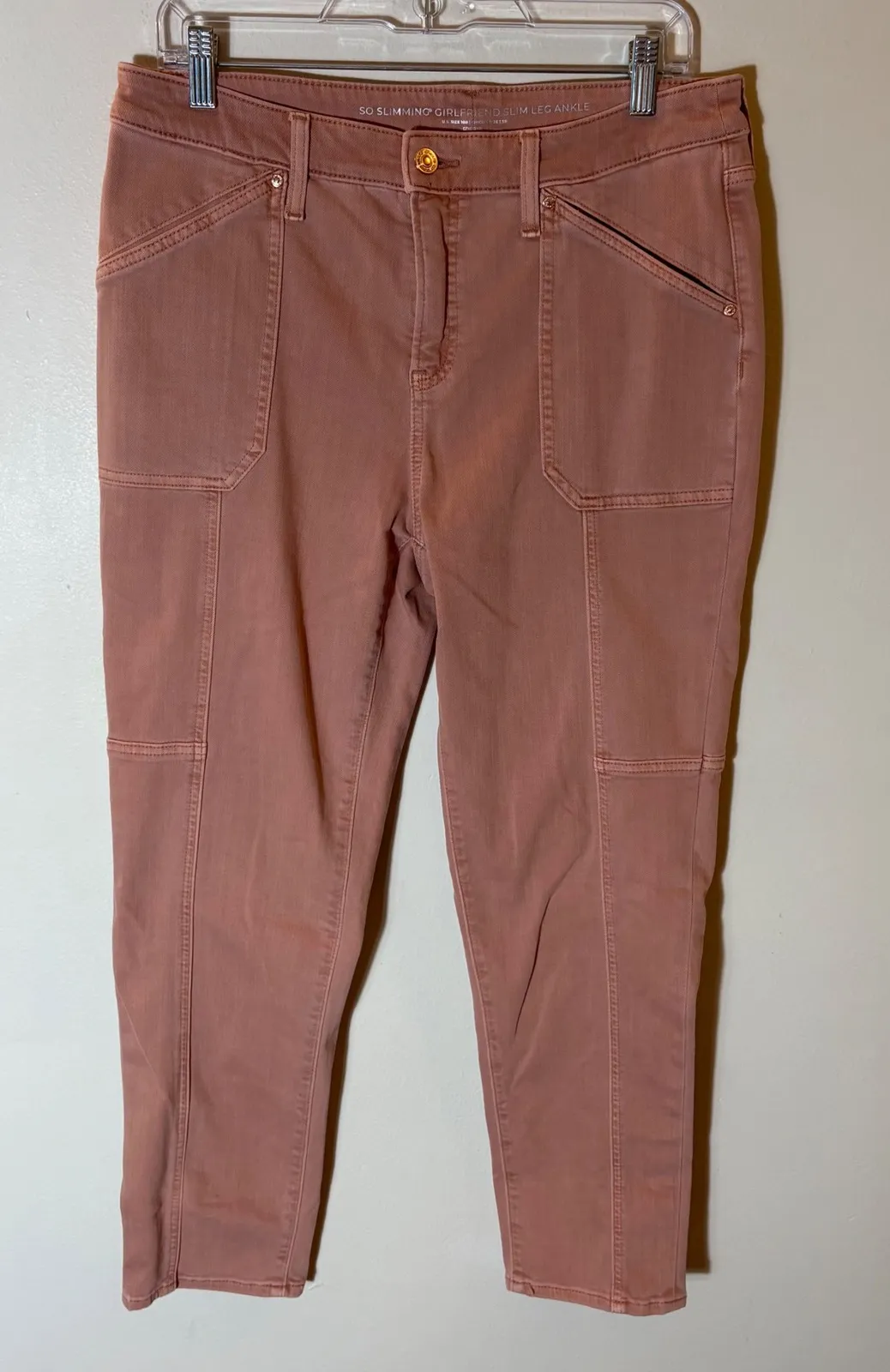 Chicos So Slimming Girlfriend Slim Leg Ankle Jeans in a beautiful desert coral (muted dusty rose / pink-clay tone) hue. These pants offer a flattering silhouette with a comfortable slim leg and ankle crop. Designed for a polished yet relaxed look, they feature stylish utility-inspired pockets and a secure button and zip closure. Perfect for casual outings, weekend adventures, or stylish office wear.