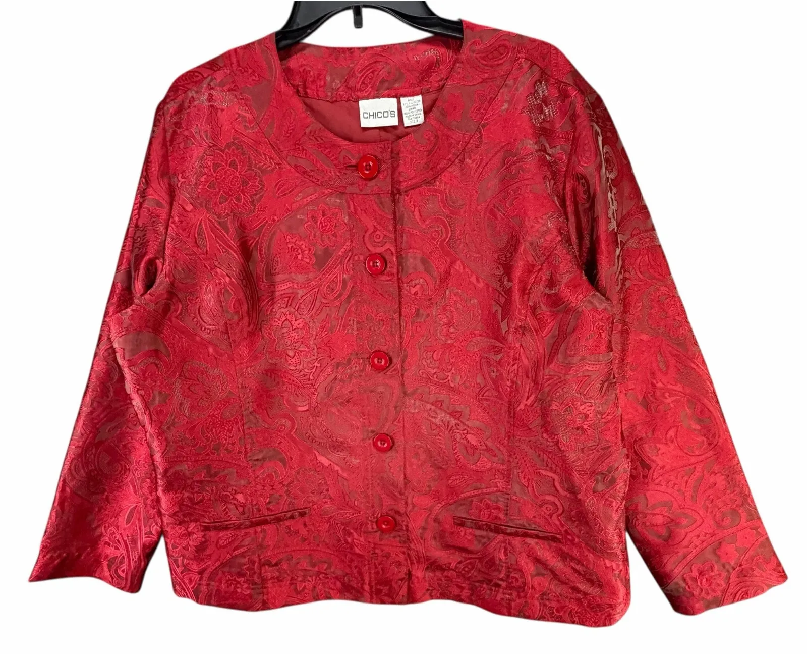 Chicos Textured Jacket Womens XL Chico Size 3 Red Floral Paisley Button Up Romantic Feminine Excell... Show more