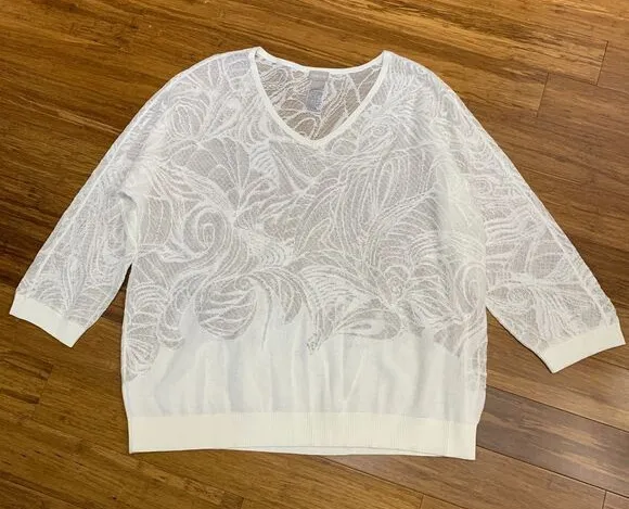 Beautiful white sweater top featuring an elegant floral lace pattern. V-neckline with 3/4 length sle... Show more