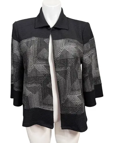This stylish Chico’s Travelers Collection jacket features a bold black and silver geometric pattern... Show more