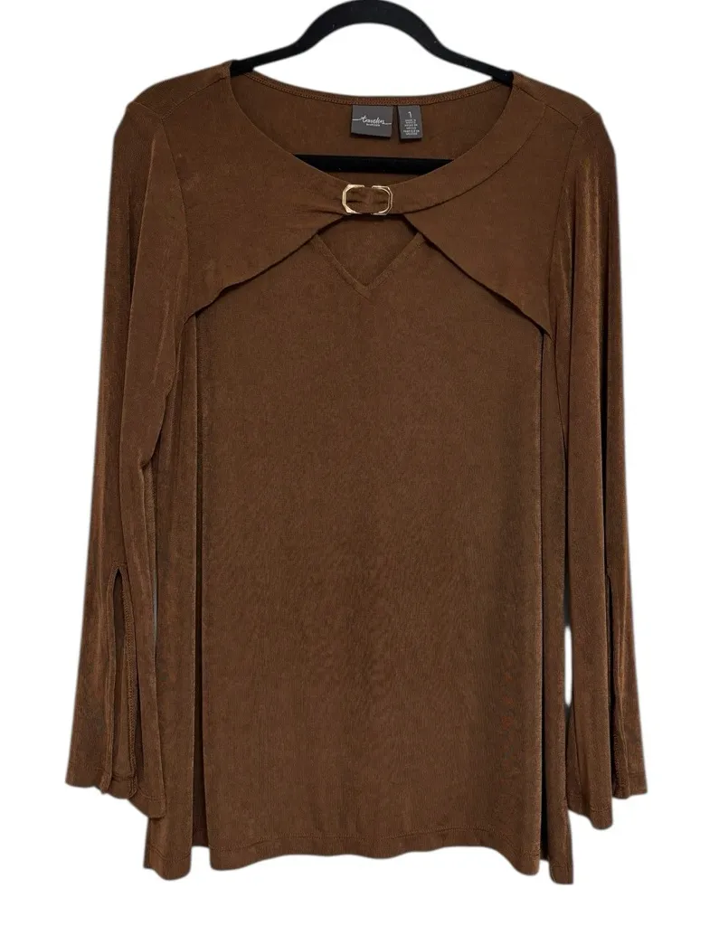 • brown with gold neck piece • scoop neck with cutout • slit bell sleeves • 96% acetate / 4% spand... Show more