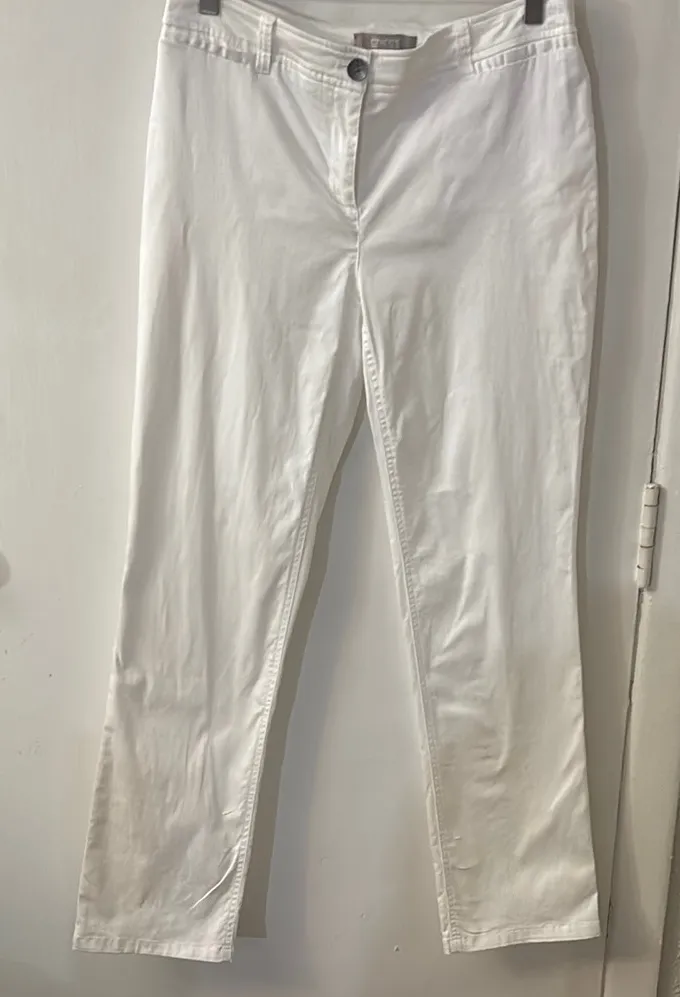 Style: Chino jeans with four faux pockets, button/zip closure Color: White Size: 0 Short Waist: 15”... Show more