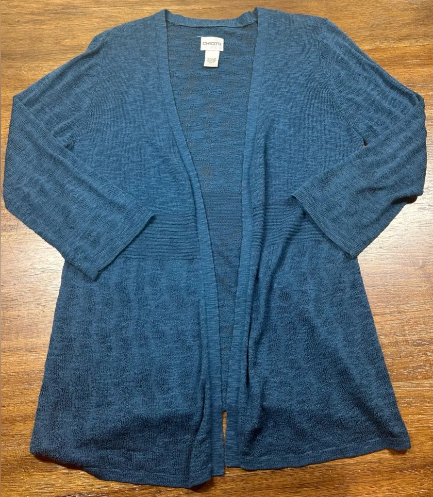 This Chico's Women’s Size M Light Ling Blue Open Front Cardigan Sweater is a stylish and versatile a... Show more