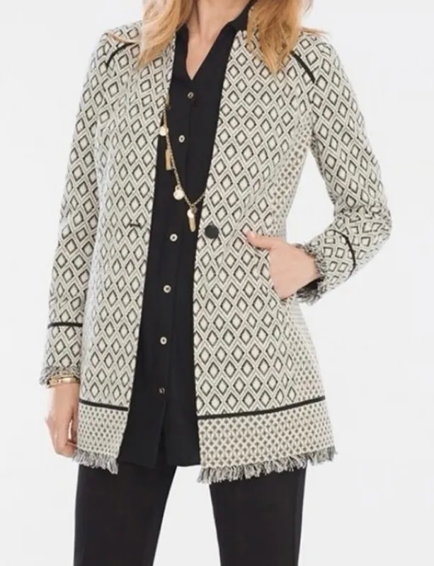 Excellent preowned condition No flaws Textured diamond print with black piping accents and contrast hem and side panels Black and cream with metallic gold flecks Short fringe hem and cuffs Single oversized black button closure Stand up collar Full measurements in photos