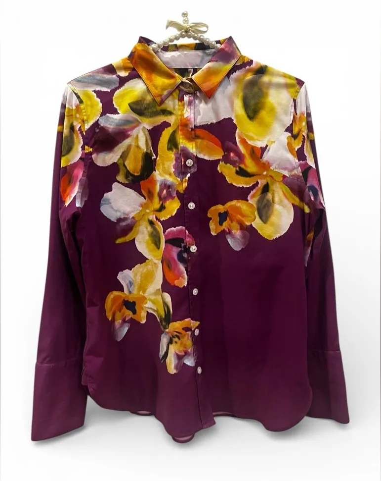 Chico's No Iron Stretch Botanical Shirt in a "Sweet Berry" Long-sleeve, collared button-down shirt... Show more