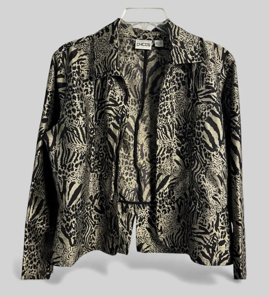 Chico’s size one ladies silk blazer. Animal print Safari leopard print mob wife \ no buttons I beli... Show more