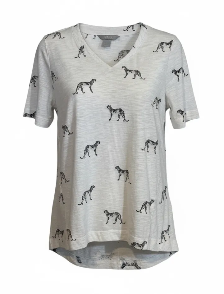 Chico's Size 1 M White Cheetah Print V Neck Short Sleeve T Shirt Top A comfortable and stylish v-ne... Show more