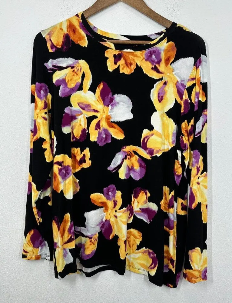 Chico's Size 3 Black Stretch Jersey Knit Longsleeve Shirt Yellow Purple Orchid Pre-Owned in Excelle... Show more