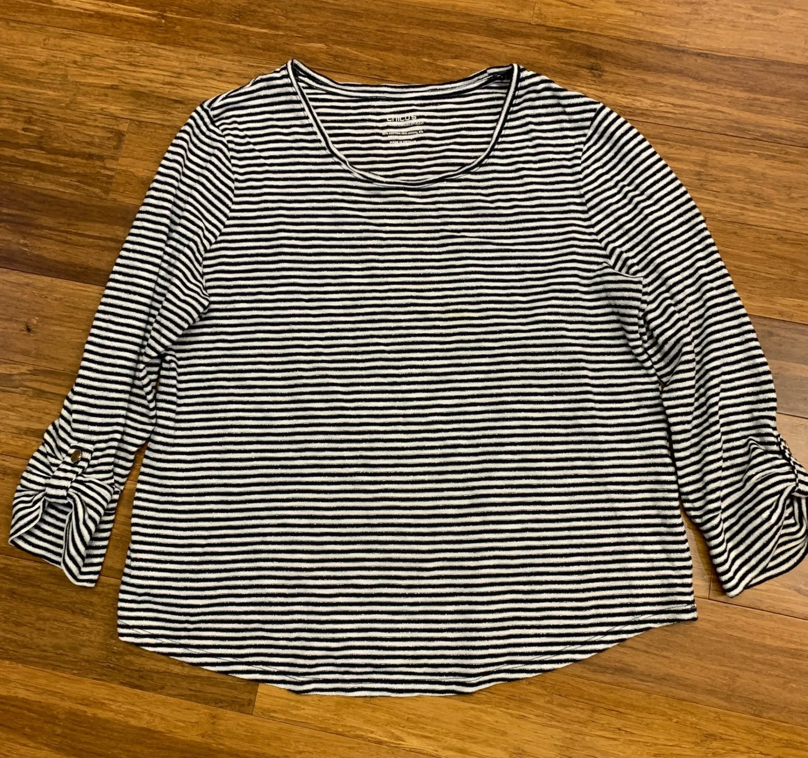 Chicos The Ultimate Tee women's striped long sleeve shirt top. This top features a scoop neckline and roll-tab cuffs with button accents. The fabric has a subtle metallic thread woven throughout, adding a touch of shimmer. Designed for comfort and a flattering fit, this versatile top is a great addition to any wardrobe. Keywords: Chicos top, striped shirt, metallic detail, long sleeve, roll tab sleeve, scoop neck, casual wear, everyday basic, comfortable, shimmer, apparel, garment Very good used condition. Open to offers!