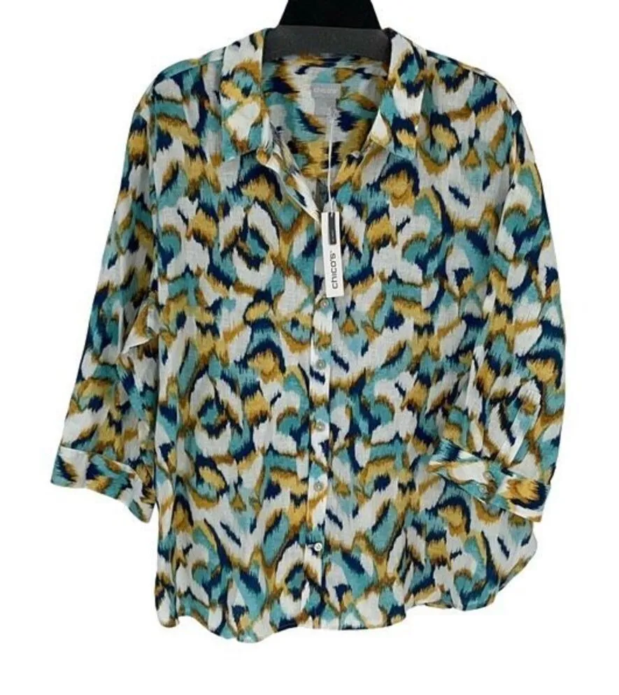 Chico's Womens Cabo Ikat 3/4 Sleeve No Iron Button Up Shirt Soleil Yellow Size 4 NWT Features: Bra... Show more