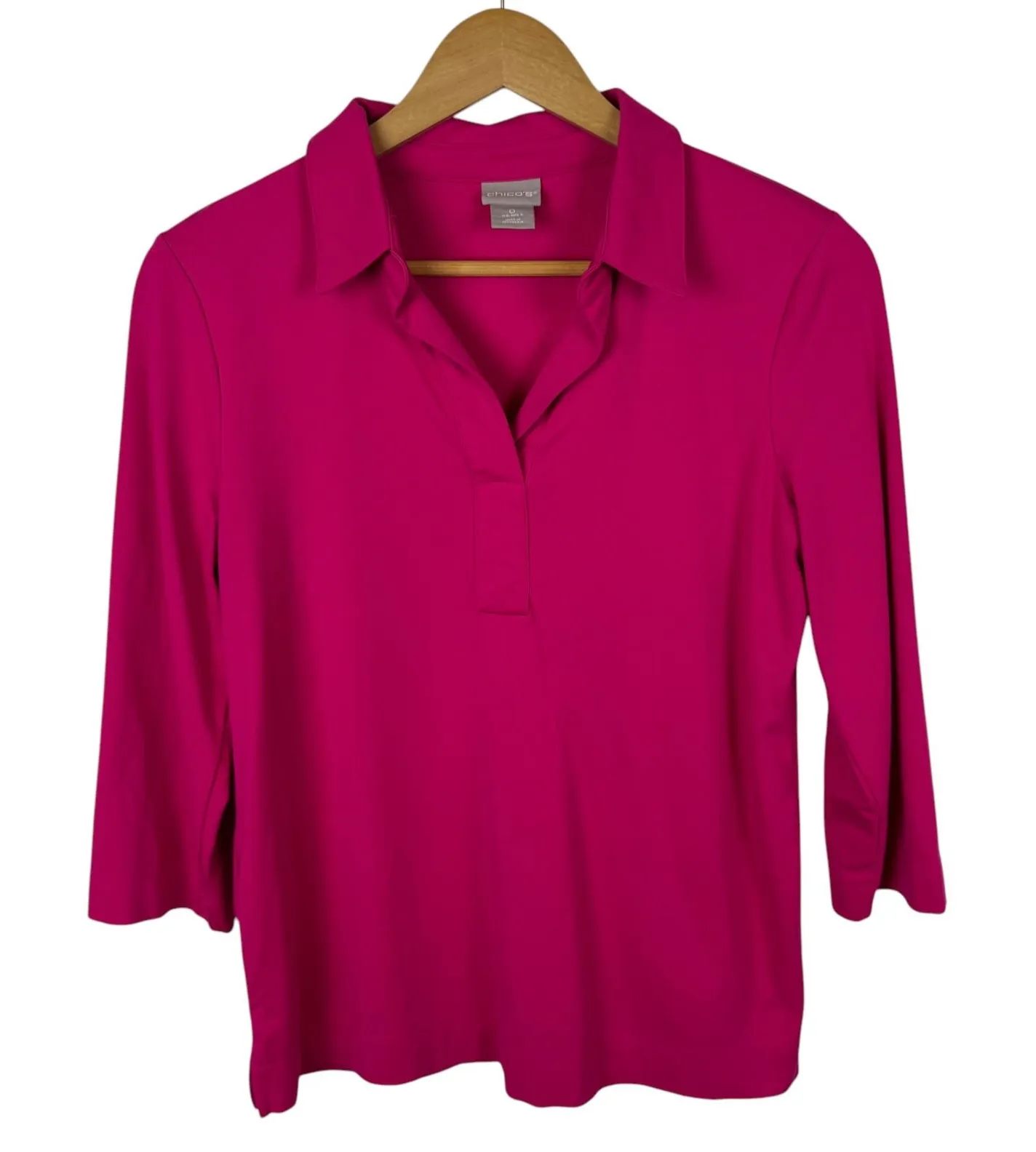 A vibrant pink polo top from Chico's, perfect for adding a pop of color to your wardrobe. This stylish blouse features a classic collared neckline with a partial button placket, and comfortable 3/4 sleeves. Its smooth, lightweight fabric offers a flattering fit and easy wear. Ideal for casual outings, relaxed office settings, or weekend brunches.