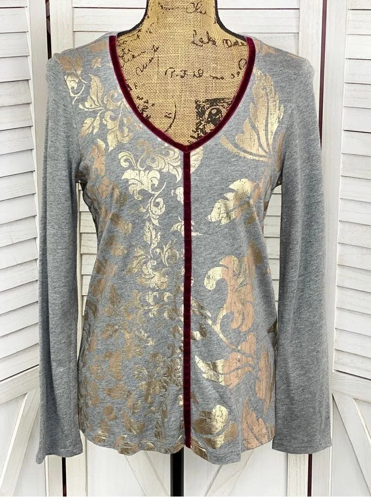 Zenergy by Chico’s Foil Damask Print Velvet Trim T Shirt Size Small 4 Chico’s Size 0 Medium gra... Show more