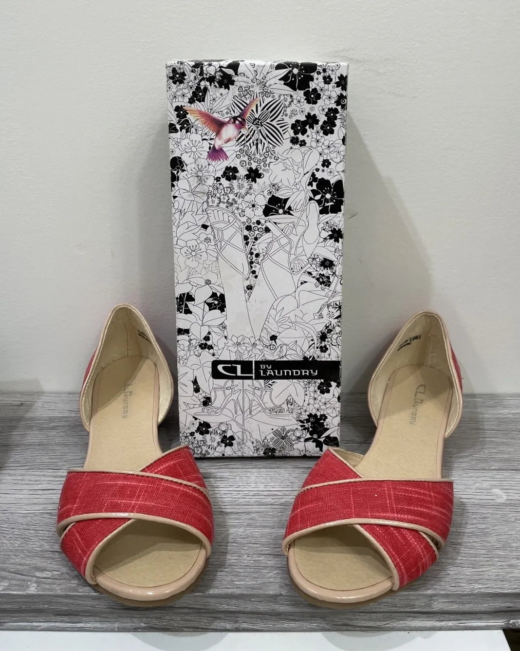 The product is a pair of Chinese Laundry Fortune linen coral 9 1/2 ladies shoes. These slip-on flats... Show more
