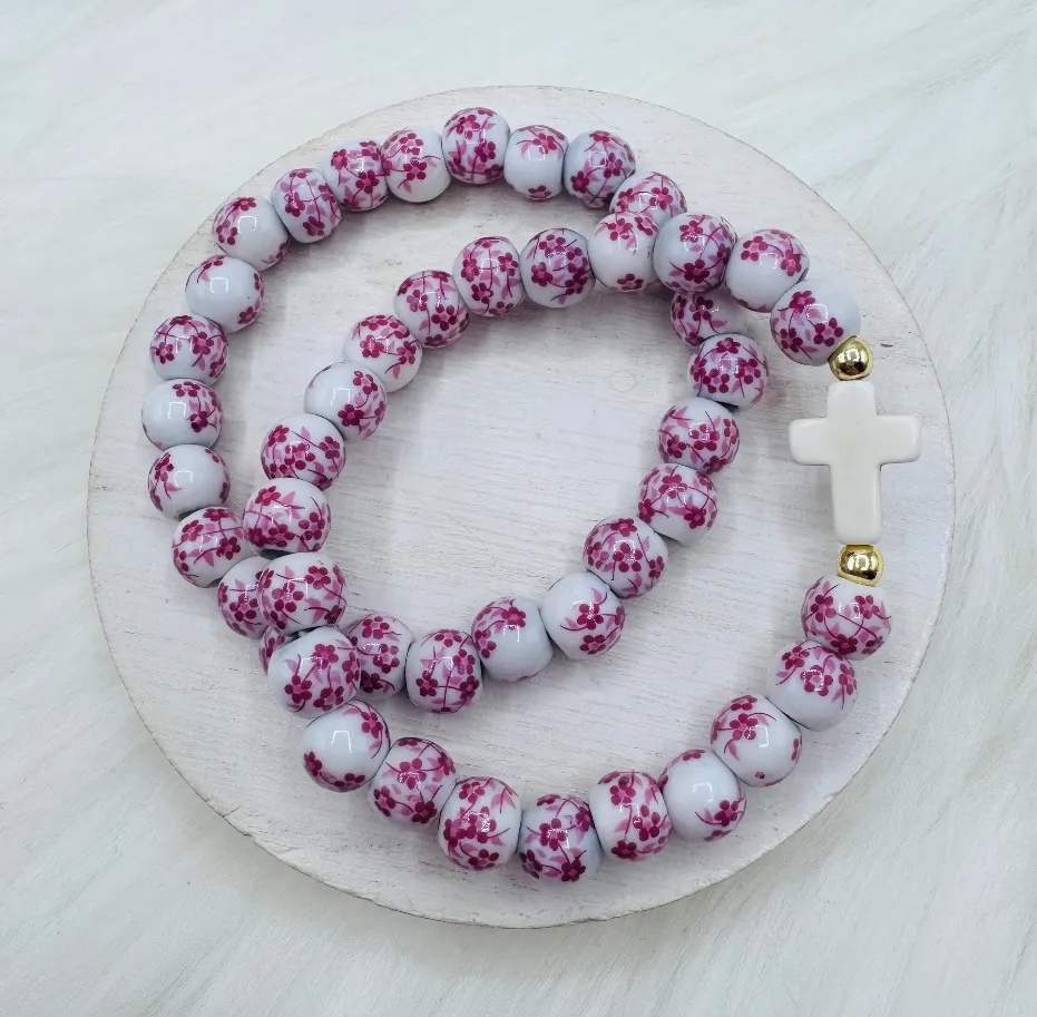 Chinese-Style Ceramic Floral Beaded Stretch Bracelet, 8mm ceramic beads Elastic bind You get two. The cross beaded one and the regular beaded one. You get what is pictured 7.2 “ length 2.1” diameter Caters to smaller wrists Just comfortably right for wrists that at 6 inches Please measure wrists prior to purchasing